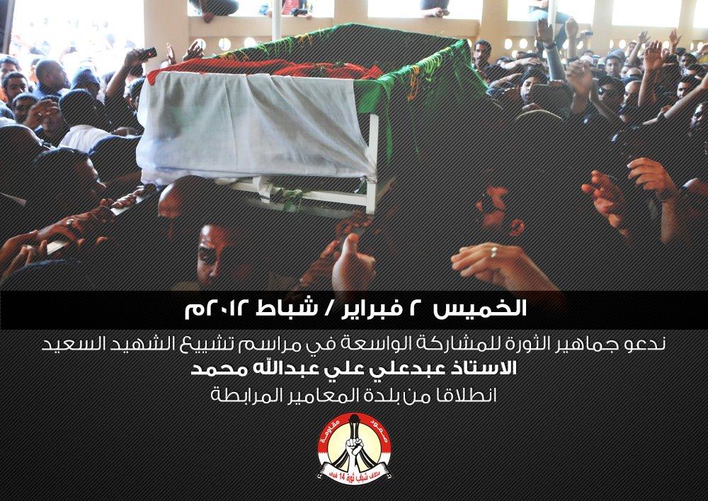 ندعو جماهير الثورة للمشاركة الواسعة في مراسم تشييع الشهيد الاستاذ عبدعلي علي .. بلدة المعامير(2.30 ظهراً).