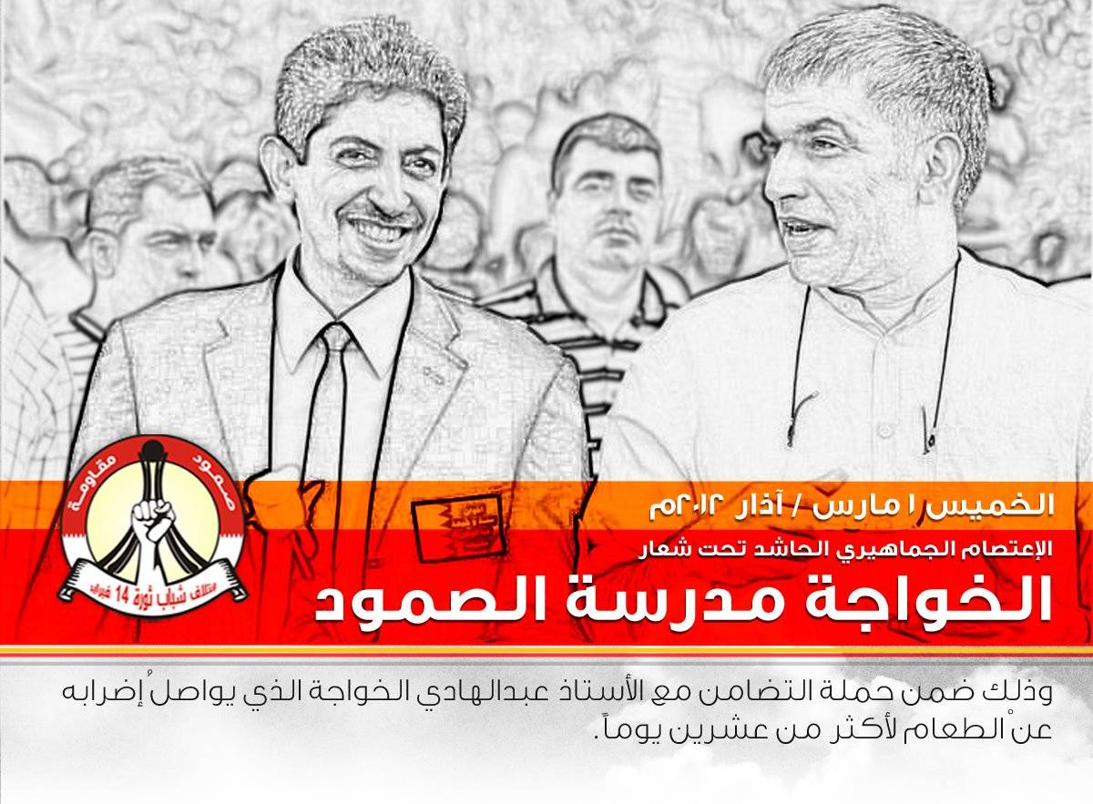 تتواصل اليوم حملة التضامن مع الرمز الوطني عبدالهادي الخواجة .. موعدنا مساء اليوم مع الاعتصام الجماهيريَ ( الخواجة مدرسة الصمود ).
