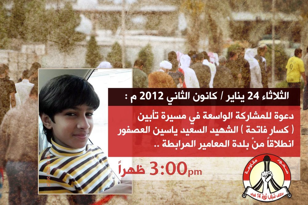 دعوة للمشاركة الواسعة في مسيرة تأبين (كسار فاتحة) الشهيد السعيد ياسين العصفور انطلاقاً منْ بلدة المعامير المرابطة ( الساعة الثالثة ظهراً).