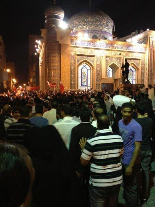جانب من الحضور المشارك في المسيرة الجماهيرية في قلب العاصمة المنامة قبل قيام المرتزقة بإطلاق النار والغازات السامّة.