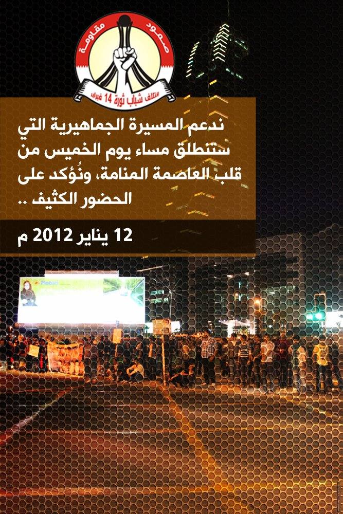 ندعم المسيرة الجماهيرية التي ستنطلق مساء يوم الخميس من قلب العاصمة المنامة، ونُؤكد على الحضور الكثيف .. 12 يناير 2012 م .