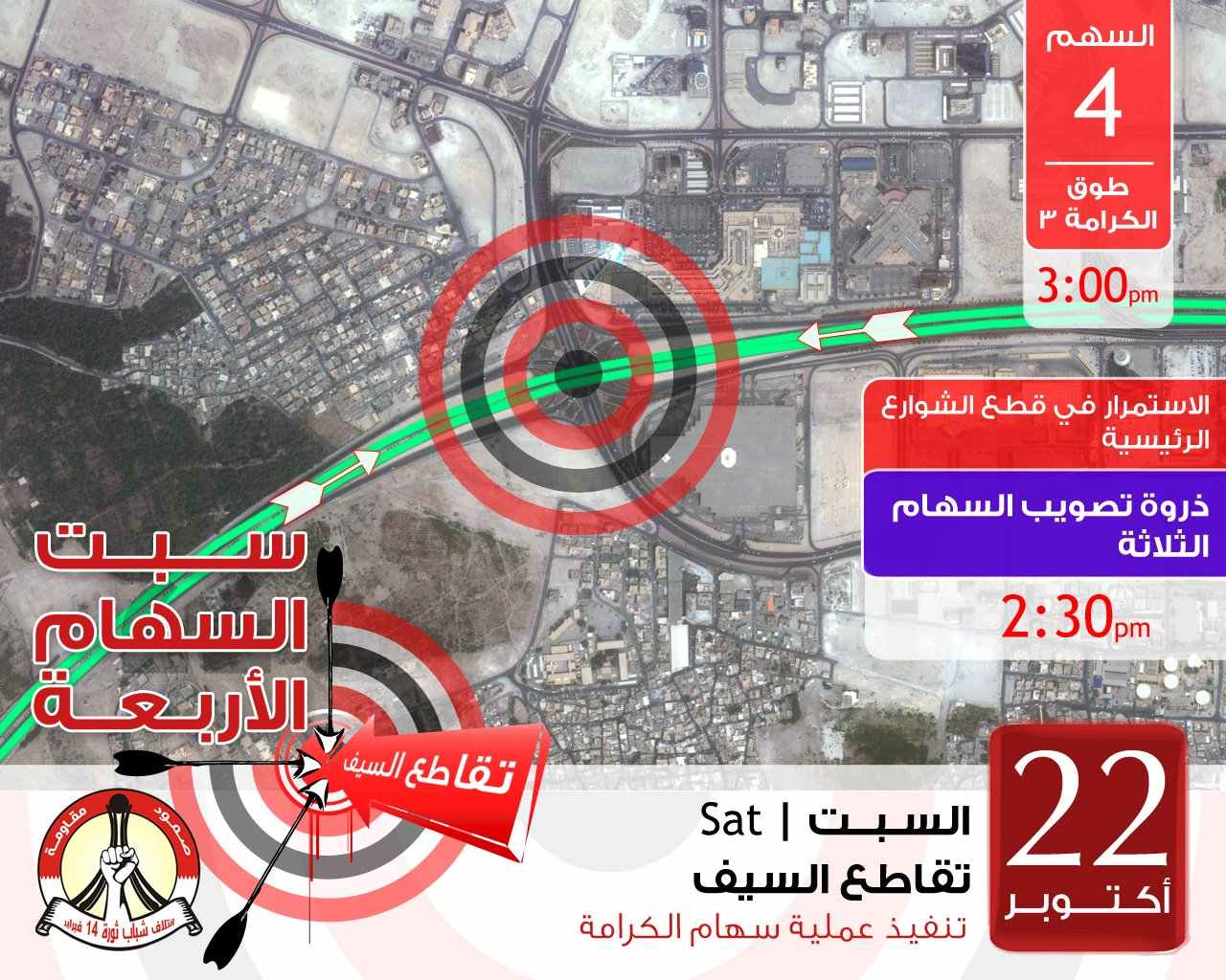 سبت السهام الأربعة: سهم الكرامة الرابع يُطوّق شارع 14 فبراير في الثالثة ظهراً، وذورة تصويب السهام الثلاثة في الثانية والنصف ظهراً، هبّوا يا أعظم الشعوب صبراً وصموداً، وما النصرُ إلا من عند الله.