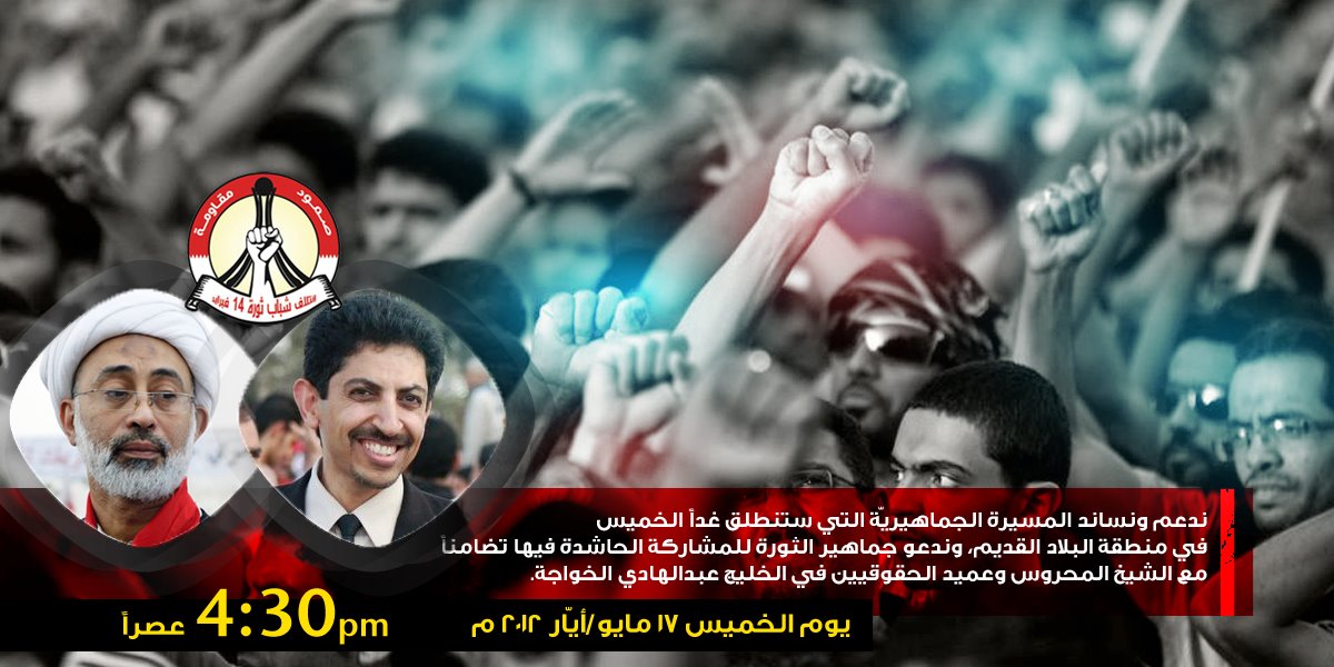 ندعم ونساند المسيرة الجماهيريّة التي ستنطلق غداً الخميس في منطقة البلاد القديم،وندعو جماهير الثورة للمشاركة الحاشدة فيها تضامناً مع الشيخ المحروس وعميد الحقوقيين في الخليج عبدالهادي الخواجة.