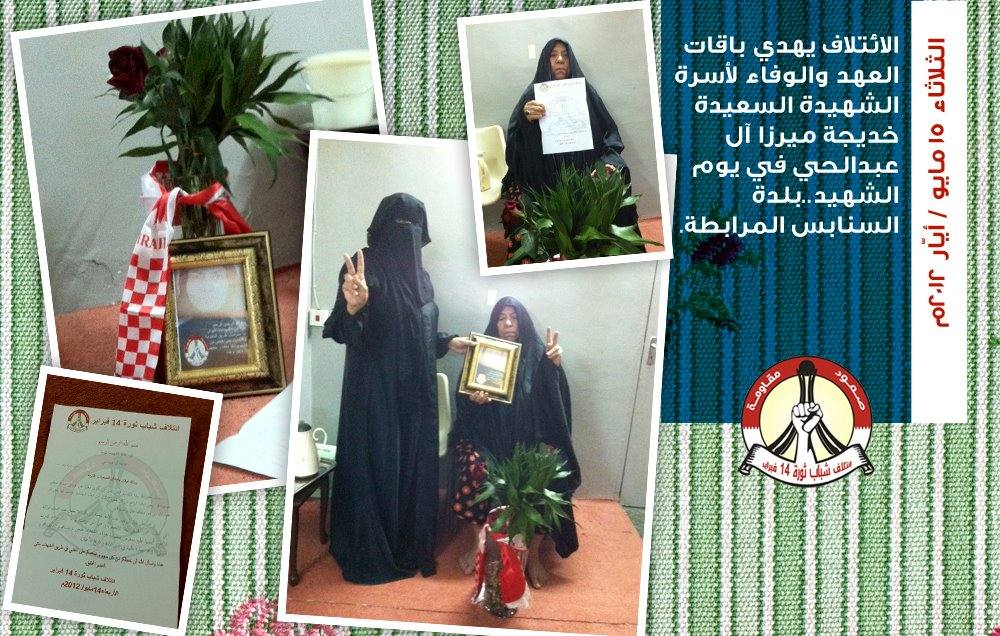 الائتلاف في زيارة العهد لأسرة الشهيدة السعيدة خديجة آل عبدالحي يهدي باقات الورود لمنْ يستحق الورود.