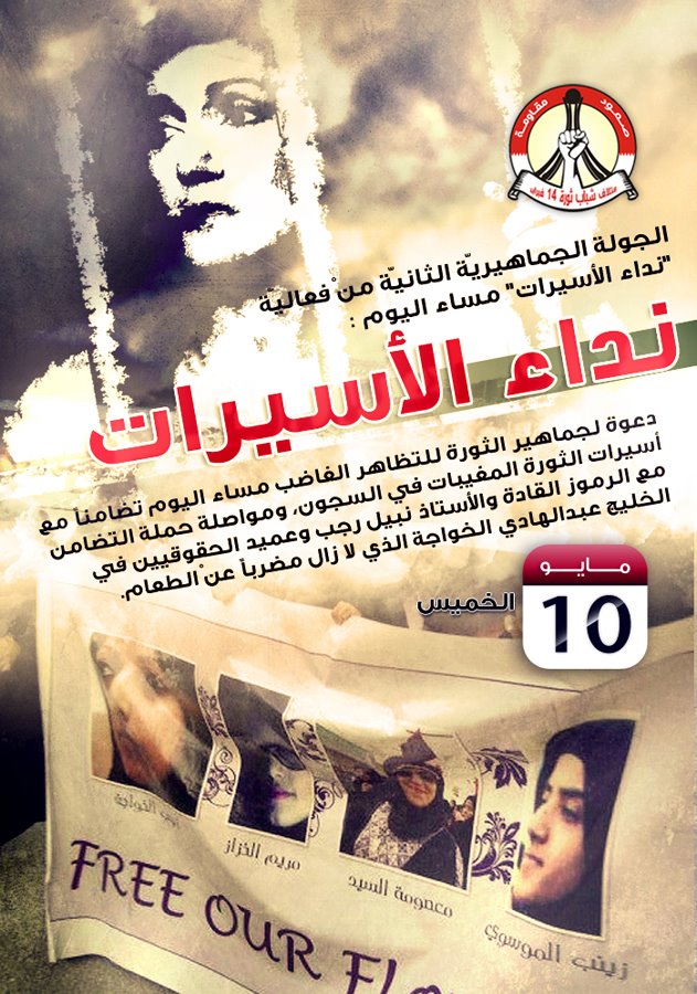 دعوة لجماهير الثورة للتظاهر الغاضب مساء اليوم تضامناً مع أسيرات الثورة المغيبات في السجون، ومواصلة حملة التضامن مع الرموز القادة والأستاذ نبيل رجب وعميد الحقوقيين في الخليج عبدالهادي الخواجة الذي لا زال مضرباً عنْ الطعام.