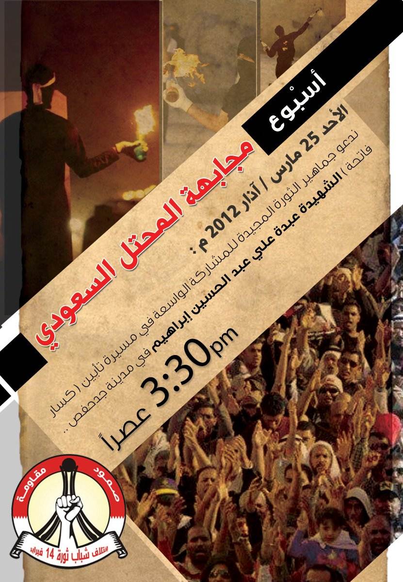 تدشين فعاليات .. ( اسبوع مجابهة المحتلّ السعودي ) ندعو جماهير الثورة المجيدة للمشاركة الواسعة في مسيرة تأبين ( كسار فاتحة ) الشهيدة عبدة علي عبد الحسين إبراهيم في مدينة جدحفص .. الساعة 3:30 عصراً.