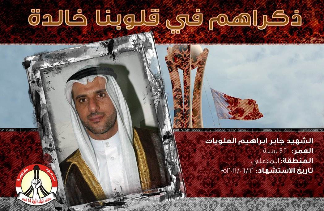ذكراهم في قلوبنا خالدة الشهيد جابر ابراهيم العلويات العمر: 42 سنة المنطقة: المصلى تاريخ الاستشهاد: 12/06/2011م