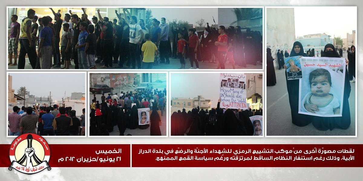 لقطات مصوّرة أُخرى منْ موكب التشييع الرمزي للشهداء الأجنّة والرضّع في بلدة الدراز الأبية، وذلك رغم استنفار النظام الساقط لمرتزقته ورُغم سياسة القمع الممنهج. الخميس 21 يونيو/حزيران 2012 م