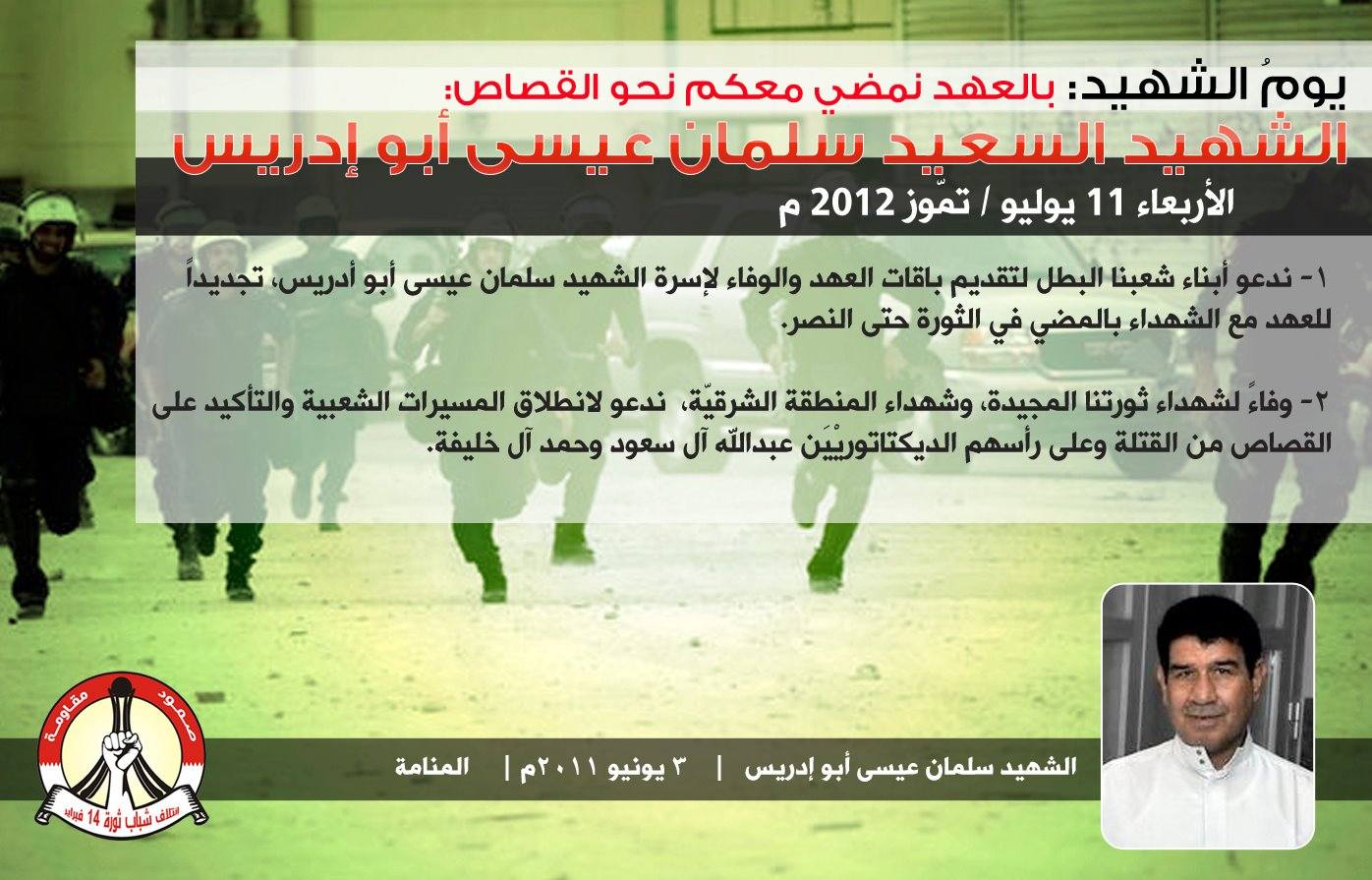 1- ندعو أبناء شعبنا البطل لتقديم باقات العهد والوفاء لإسرة الشهيد سلمان عيسى أبو أدريس، تجديداً للعهد مع الشهداء بالمضي في الثورة حتى النصر.