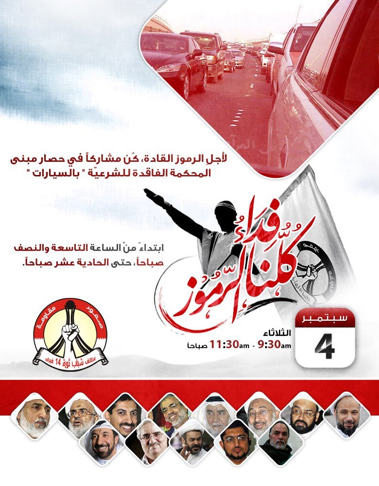 لأجلِ الرموز القادة، كُن مشاركاً في فعالية”السيارات”بهدفِ فرض الحصار في المنطقة الدبلوماسيّة وحول مبنى المحكمة الفاقدة للشرعيّة، وذلك في يوم الثلاثاء القادم تزامناً مع انعقاد جلسة محاكمة الرموز القادة..ابتداءً منْ الساعة التاسعة والنصف صباحاً، حتى الحادية عشر صباحاً.