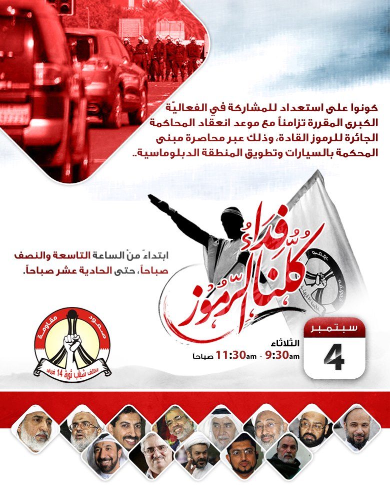 كونوا على استعداد للمشاركة في الفعاليّة الكبرى المقررة تزامناً مع موعد انعقاد المحاكمة الجائرة للرموز القادة، وذلك عبر محاصرة مبنى المحكمة بالسيارات وتطويق المنطقة الدبلوماسية..
