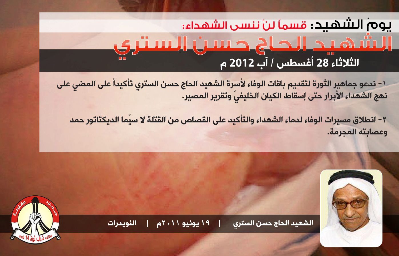 1- ندعو جماهير الثورة لتقديم باقات الوفاء لأسرة الشهيد الحاج حسن الستري تأكيداً على المضي على نهج الشهداء الأبرار حتى إسقاط الكيان الخليفيّ وتقرير المصير.