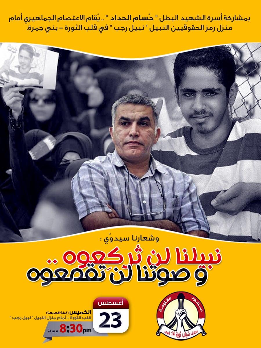 بمشاركة أسرة الشهيد البطل ” حُسام الحداد ” .. يُقام الاعتصام الجماهيري أمام منزل رمز الحقوقيين النبيل ” نبيل رجب ” في قلب الثورة – بني جمرة.