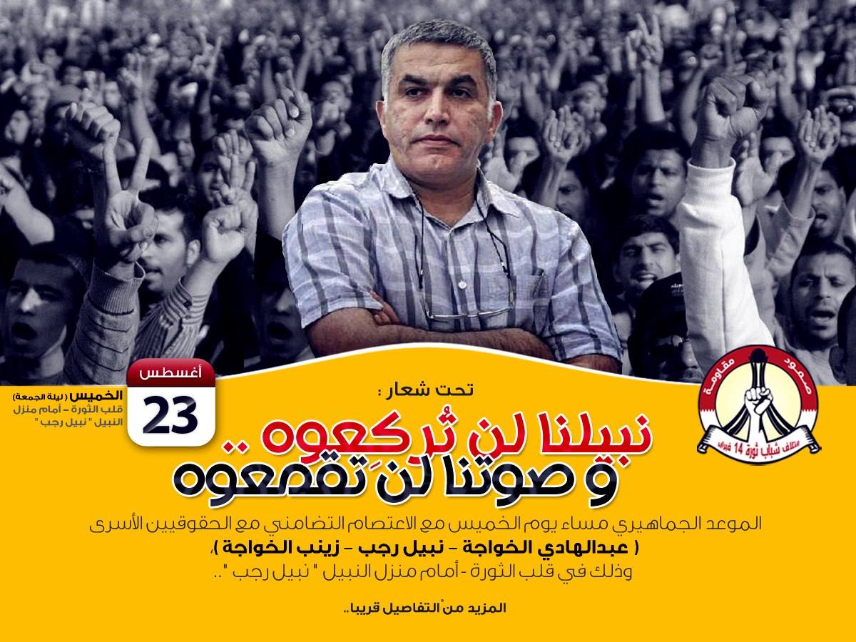 الموعد الجماهيري مساء يوم الخميس مع الاعتصام التضامني مع الحقوقيين الأسرى ( عبدالهادي الخواجة – نبيل رجب – زينب الخواجة )، وذلك في قلب الثورة – أمام منزل النبيل ” نبيل رجب “..