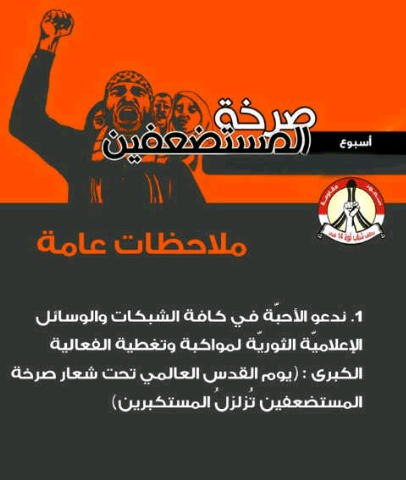 ملاحظات عامّة: 1. ندعو الأحبّة في كافة الشبكات والوسائل الإعلاميّة الثوريّة لمواكبة وتغطية الفعاليّة الكبرى (يوم القدس العالمي تحت شعار ” صرخةُ المستضعفين تُزلزلُ المستكبرين “).