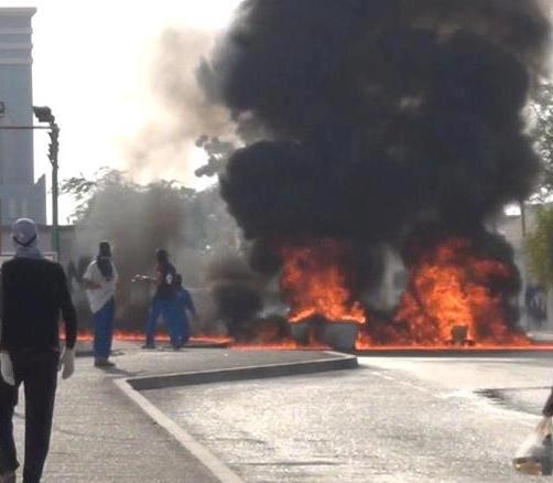 غضبٌ يشتعل منْ أجلِ الرموز القادة .. أبطال الميادين يُشعلون النيران وسط الشارع المؤدي نحو القاعدة الأمريكيّة في الجفير ضمن عمليّة ” الانتصار للرموز”.