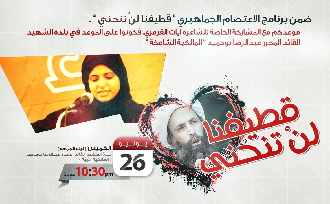ضمن برنامج الاعتصام الجماهيري”قطيفنا لنْ تنحني”.. موعدكم الليلة مع المشاركة الخاصة للشاعرة آيات القرمزي، فكونوا على الموعد في بلدة الشهيد القائد المحرر عبدالرضا بوحميد ” المالكية الشامخة ”..العاشرة والنصف مساءً.