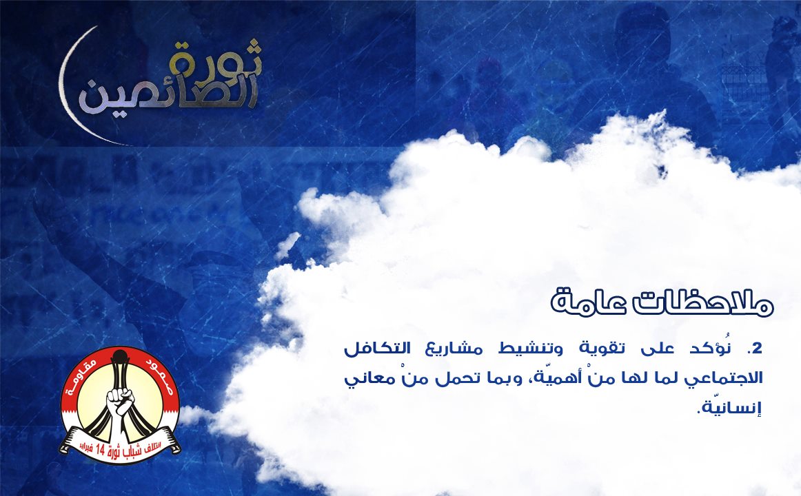 ملاحظات عامّة: 2. نُؤكد على تقوية وتنشيط مشاريع التكافل الاجتماعي لما لها منْ أهميّة، وبما تحمل منْ معاني إنسانيّة.