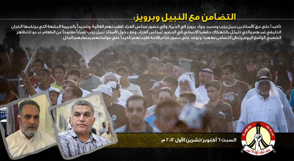 تأكيداً على حقّ الأستاذين نبيل رجب ومحمد جواد برويز في الحُريّة، وفي حضور مجلس العزاء لفقيدتهم الغالية، وتنديداً بالجريمة البشعة التي يرتكبها الكيان الخليفي ضدهم والتي تتمثل بانتهكاك حقهما الإنساني في الحضور لمجلس العزاء، ومع دخول الأستاذ نبيل رجب إضراباً مفتوحاً عن الطعام، ندعو للتظاهر الشعبي الواسع اليوم وإعلان التضامن معهما، ونؤكد على حضور خِتام فاتحة فقيدتهم تأكيداً على مواساتهم بمصابهم الجلل.